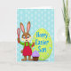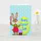 This design shows a cheerful brown bunny baker 🐰 with sparkling blue eyes and a wide smile, standing as if sharing a sweet moment with whoever’s looking. The bunny wears a bright green top and a red apron, holding a red whisk in one paw and a smaller red utensil in the other, like it’s mid-recipe and eager to treat a friend. On the right side sits a large green egg that feels like it’s being presented as a gift, decorated with small pink and blue flowers and a few tiny accents that soften the scene 🌷. Across the egg, a short greeting appears in blue lettering, centered and easy to spot against the green. In the foreground, a cupcake with a deep brown base is topped with a generous swirl of pastel purple frosting, dotted with tiny blue star sprinkles. The background stays light blue with a subtle pattern of lighter blue diamonds, giving the scene a gentle, cozy setting. The green egg on the right and the cupcake at the bottom front balance the bunny on the left, with the blue text sitting neatly on the egg’s face.