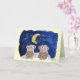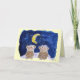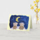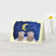 Cute cartoon monkeys are sitting under a banana moon with a starry night of sparkling stars in a special moment together celebrating their anniversary. Funny saying inside reads: "Happy Bananaversary!" and then also "I'm so glad we met"