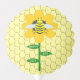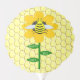 This awesome Balloon features a graphic image of a cute yellow bumblebee with black stripes, eyes, antennae and legs. It has pretty blue and white wings. The bee is sitting on the middle of a golden yellow sunflower. The flower has a green stalk and three leaves. The message "happy bee day" appears spread over the three leaves. The background is composed of a yellow honeycomb pattern.