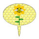 This awesome cake decoration features a graphic image of a cute yellow bumblebee with black stripes, eyes, antennae and legs. It has pretty blue and white wings. The bee is sitting on the middle of a golden yellow sunflower. The flower has a green stalk and three leaves. The message "happy bee day" appears spread over the three leaves. The background is composed of a yellow honeycomb pattern.