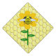 This awesome graduation cap topper features a graphic image of a cute yellow bumblebee with black stripes, eyes, antennae and legs. It has pretty blue and white wings. The bee is sitting on the middle of a golden yellow sunflower. The flower has a green stalk and three leaves. The message "happy bee day" appears spread over the three leaves. The background is composed of a yellow honeycomb pattern.