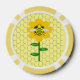 This awesome set of poker chips features a graphic image of a cute yellow bumblebee with black stripes, eyes, antennae and legs. It has pretty blue and white wings. The bee is sitting on the middle of a golden yellow sunflower. The flower has a green stalk and three leaves. The message "happy bee day" appears spread over the three leaves. The background is composed of a yellow honeycomb pattern.