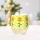 This awesome stemless wine glass features a graphic image of a cute yellow bumblebee with black stripes, eyes, antennae and legs. It has pretty blue and white wings. The bee is sitting on the middle of a golden yellow sunflower. The flower has a green stalk and three leaves. The message "happy bee day" appears spread over the three leaves. The background is composed of a yellow honeycomb pattern.