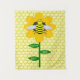 This awesome tapestry features a graphic image of a cute yellow bumblebee with black stripes, eyes, antennae and legs. It has pretty blue and white wings. The bee is sitting on the middle of a golden yellow sunflower. The flower has a green stalk and three leaves. The message "happy bee day" appears spread over the three leaves. The background is composed of a yellow honeycomb pattern.
