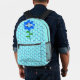 This awesome backpack features a graphic image of a cute blue bumblebee with bright blue stripes, black eyes, blue antennae and black legs. It has pretty blue and white wings. The bee is sitting on the middle of a pretty blue sunflower. The flower has a green stalk and three leaves. The message "Bee Day boy" appears spread over the three leaves. The background is composed of a pale blue honeycomb pattern.