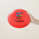 Wham-o Frisbee with rainbow text "Happy Being Me", add a name, outdoor gear, toy you throw back and forth in the air, lawn game. pets, picnic