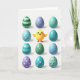Designed with a cheerful spring scene, this card features a round, animated yellow bird centered on a bright white background, with wide eyes, rosy cheeks, and tiny wings held slightly open as if reaching out to a close friend. Around it sits a tidy grid of twelve decorated eggs, creating a balanced frame that feels like a shared little celebration 🐰. The palette stays soft and pastel, mixing gentle blues, greens, and purples with pops of sunny yellow. Several eggs show white or yellow polka dots, while others carry neat horizontal stripes, small geometric shapes, or tiny floral clusters with pink blossoms and green leaves 🌷. Soft, diffused lighting adds mild shadows under each egg and beneath the bird, giving the shapes a smooth, slightly glossy look. A short Easter greeting appears near the top in a light, friendly color, with smaller text placed below in a matching tone. The final layout shows the yellow bird in the middle, surrounded evenly by the twelve patterned eggs on the white backdrop.