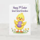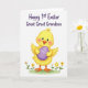 This design shows a round, sunlit yellow chick centered on a white background, with rosy cheeks and big blue eyes that seem to meet yours with a friendly, affectionate gaze 🐰. It holds an egg close to its belly as if it’s a small gift for someone special, and the egg is decorated with gentle lavender stripes. The chick’s tiny three-toed feet rest on a small patch of green ground, creating a cozy little setting that feels like a shared springtime moment. Scattered around the grass are simple flowers, including one small white bloom and a few yellow blossoms that echo the chick’s warm color 🌷. Above the character, a short holiday greeting sits near the top in deep indigo lettering, centered so it frames the scene from overhead. The soft lighting adds rounded shading to the chick’s body, giving it a slightly three-dimensional look without heavy shadows. A white background keeps everything airy and uncluttered, with the indigo text at the top and the lavender-striped egg held snugly at the center.