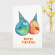 Adorable Happy Birthday card featuring 2 little hand-drawn birds wearing birthday hats. Blank inside, ready for your custom text and/or photo personalization. © HomeStyle Design Studio