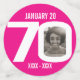 70th birthday bright hot pink and white graphic stripe and text party confetti. Great to add a personal touch to a surprise birthday party. Personalize with three of your birthday girls photos in the 0 of 70 and personalize with your choice of name. Design by Sarah Trett for www.mylittleeden.com