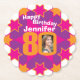 80th birthday party paper coasters. Great to add a personal touch to a surprise 80th birthday party. Personalize with your birthday girls photo in the 0 of 80 and personalize with your choice of name. Design by Sarah Trett.