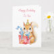 A sweet birthday card for her, with a watercolor squirrel in a birthday hat holding a gift. Inside is a sweet message wishing someone a birthday full of surprises!