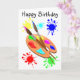 Birthday card for all ages. An artist palette with splodges of colourful paint and two paint brushes, ideal for an artist or painter. A templates on the front and the inside of the card for you to use as they are or replace with your own message.