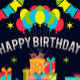 A digital illustration for a birthday celebration, featuring a dark blue background adorned with colorful elements. At the top, a festive garland of triangular flags in red, yellow, green, and blue stretches across, interspersed with yellow starbursts. Below the garland, a cluster of balloons in red, yellow, green, and blue floats above the words "HAPPY BIRTHDAY" in large, white block letters. Underneath the text, a stack of gift boxes in various sizes and colors, including orange with polka dots, red, green, and blue, are tied with ribbons and bows. The background is further decorated with scattered starbursts in different colors, adding to the celebratory atmosphere. The illustration is clean and graphic, with a flat design style and bold colors.
