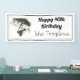 A minimalist Happy Birthday banner for the avid fisherman in your life. Customize all aspects of this banner for any event. The design features a largemouth bass jumping out of the water and the lettering is on a diamond plate looking background.