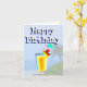 Fruity umbrella drink cocktails on a tropical beach create a fun happy birthday greeting card for any age. Blue ocean water, palm trees and the ubiquitous paper umbrella. The text greeting may be personalized. Shown in a notecard size.