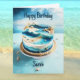 Celebrate with this stunning ocean beach-themed birthday cake card, perfect for beach lovers, surfers, and anyone who adores coastal beauty.
