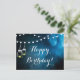 A romantic dark and blue evening and night with a full moon and light strings. Two painted mason jars with candles. With the text: Happy Birthday!