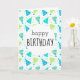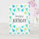 This birthday card features the words "Happy Birthday" on the front with a blue and yellow party hat and confetti pattern design! The inside reads "I hope your special day is filled with all the things you love. Happy Birthday!".