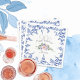 Blue and white, floral leaf, seamless, repeating pattern in background, a white flower shape layer, and templates created for a special birthday. A blue and blush pink floral arrangement in center, "Happy Birthday" curved text above it.