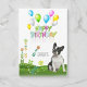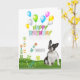 This cheerful birthday card features an adorable black and white Boston Terrier sitting in a bright, sunny garden. The design is filled with colorful floating balloons and whimsical flowers that create a fun and happy feeling. It has a clean, simple look that makes the playful "HAPPY BIRTHDAY" message really stand out against the white background. You can even add a name to make it extra special, making it the perfect choice for any dog lover celebrating their big day.