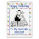 Builder cartoon. Builders stands surrounded by construction products. Personalize with your own details and message. Birthday card for a builder.