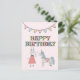Happy Birthday with Happy Birthday in doodle letters in pastel colors and embellished with dots. Doodle bunding flags in alternating colors and a cartoon rabbit in a pink dress holding a tulip flower for a gray unicorn.