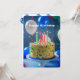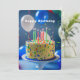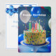 Beautiful birthday card with a pretty party cake with green and red striped candles. Blue balloons on reverse have a realistic look. Perfect for any person, family or friend.