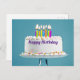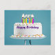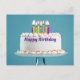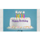 A beautifully decorated birthday cake with colorful candles lit on top, set against a soft blue background.