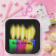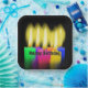 Close up of colorful glowing birthday candles on black background with Happy Birthday text.