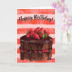 A delicious looking chocolate and strawberry cake with Happy Birthday wishes.