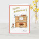 Happy birthday greeting card with piano, cat and dog. Humorous cartoon greeting card for music lovers.
