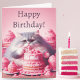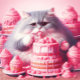 A sweet ai artwork of a fat cat that is enjoying pink birthday cakes and cupcakes for someone who loves cats and sweets! this birthday card can be for children or adults.