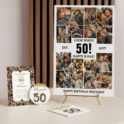 Celebrate a milestone in style with our “Happy Birthday – Cheers to 50 Wonderful Years” personalized foam board sign! This eye-catching design features a festive gold confetti motif sprinkled along the top, adding a joyful sparkle to your celebration. Bold, arched "Happy Birthday" text crowns the layout, making a striking statement that sets the tone for the party. Make it truly special by personalizing the foam board with your loved one’s name and 13 of your favorite photo memories, artfully arranged inside the number "50" — a unique and meaningful way to reflect on the wonderful journey so far. Whether displayed at a party entrance, memory table, or photo area, this foam board adds a fun and heartfelt touch to the celebration.