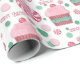 This delightful birthday present wrapping paper is so fun with it's design of pink frosted cupcakes, red and white swirled candies, and green and pink polka dots. The words Happy Birthday are also a part of the pattern.