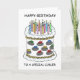 A cartoon birthday cake covered in lit candles and decorated with colorful curling stones around the outside. The words 'Happy birthday to a special curler' accompany the image.