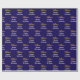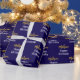 This dark blue wrapping paper has a text pattern for the recipient's name in a faux gold script and the phrase Happy Birthday. The name (Shown: Madison) appears in an elegant faux (not foil) gold script. The other text is white. All of the text can be edited.