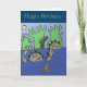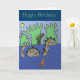 This lovely childrens birthday card, shows a simple cartoon of a spotty dinosaur, in a blue lake with bright green plants against a light blue sky. It is bright and colorful, with text that can be altered by you to make it personal.