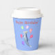Paper cups with my design of a leaping dolphin surrounded by balloons, wearing a party hat. Text says "Happy Birthday!"