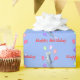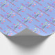 Blue birthday gift wrap with my design of a leaping dolphin surrounded by balloons, wearing a party hat. Text says "Happy Birthday"