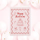 Festive happy birthday doodle greeting card featuring a cake, candle, stars, gift box, ribbon, and party accents with a playful wavy border. Perfect for celebrating birthdays with friends, family, or coworkers.
