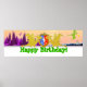 Happy Birthday Dragons Party Banner Poster Print. A cartoon dragon crest and a dragon world with mountains and castle and fire breathing dragons flying in the sky landscape with fully customzable text "Happy Birthday!" full-color poster banner. This super cool dragon party banner poster for kids is fully customizable, add your texts and images! A great dragon party decoration or gift for the big little dragon fan!