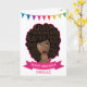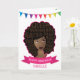 Celebrate your sister, girlfriend, auntie with this card. This design features "Queen, phenomenal, beautiful, smart, magic, boss, loving, sexy, independent, funny, creative, and strong" nested in her afro, with layered necklaces and a colorful gradient banner. Customize the message on the pink ribbon and name.