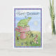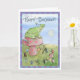 The frog sports a blue spotted birthday hat as he sits on a pink spotted mushroom and is serenaded by a strolling, eleven piece insect band.