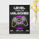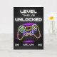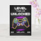 This custom age card is designed with a bold, high-energy gamer aesthetic that instantly feels fun and modern. Set against a dark, textured background, the card features glowing neon-style artwork of a game controller, outlined in vibrant yellow, blue, green, and purple lights. The controller mimics a retro-arcade look while still feeling current, creating a perfect balance of nostalgia and modern gaming culture. Above it, the pixel-style text “LEVEL UNLOCKED” appears in bright white, evoking classic video game achievement screens. The design allows for a custom age or level number to be added, making the card feel like a personal in-game milestone. Subtle neon streaks and directional arrows enhance the sense of motion and progression, reinforcing the idea of leveling up in life—just like in a favorite game.