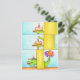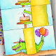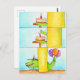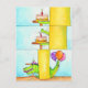 This card comes in three cartoon vignettes. The first one shows a yellow pillar on a sky blue background. On the left of the pillar, a cake stands on a small table. The cake is made of yellow sponge, with a chocolate filling, and pink frosting. On it a red birthday candle is lit. A little green lower jaw extends from behind the pillar and towards the cake. In the second vignette, the upper jaw is snapping down towards the lower jaw. It will snap on the cake.