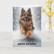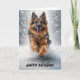 A joyful German Shepherd bounds through a wintry forest path, kicking up the soft snow as it races forward.