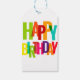 A vibrant birthday tag featuring the words "Happy Birthday" in bold,