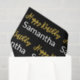 This black paper has faux (not foil) gold script that says Happy Birthday. It also has white text for the recipient's name. (Shown: Samantha) The text is in a pattern.