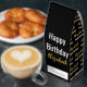 The roasted coffee box is black. The recipient's name is in a faux (not foil) gold script. The phrase Happy Birthday is in white, but not in a script. All of the text can be edited.